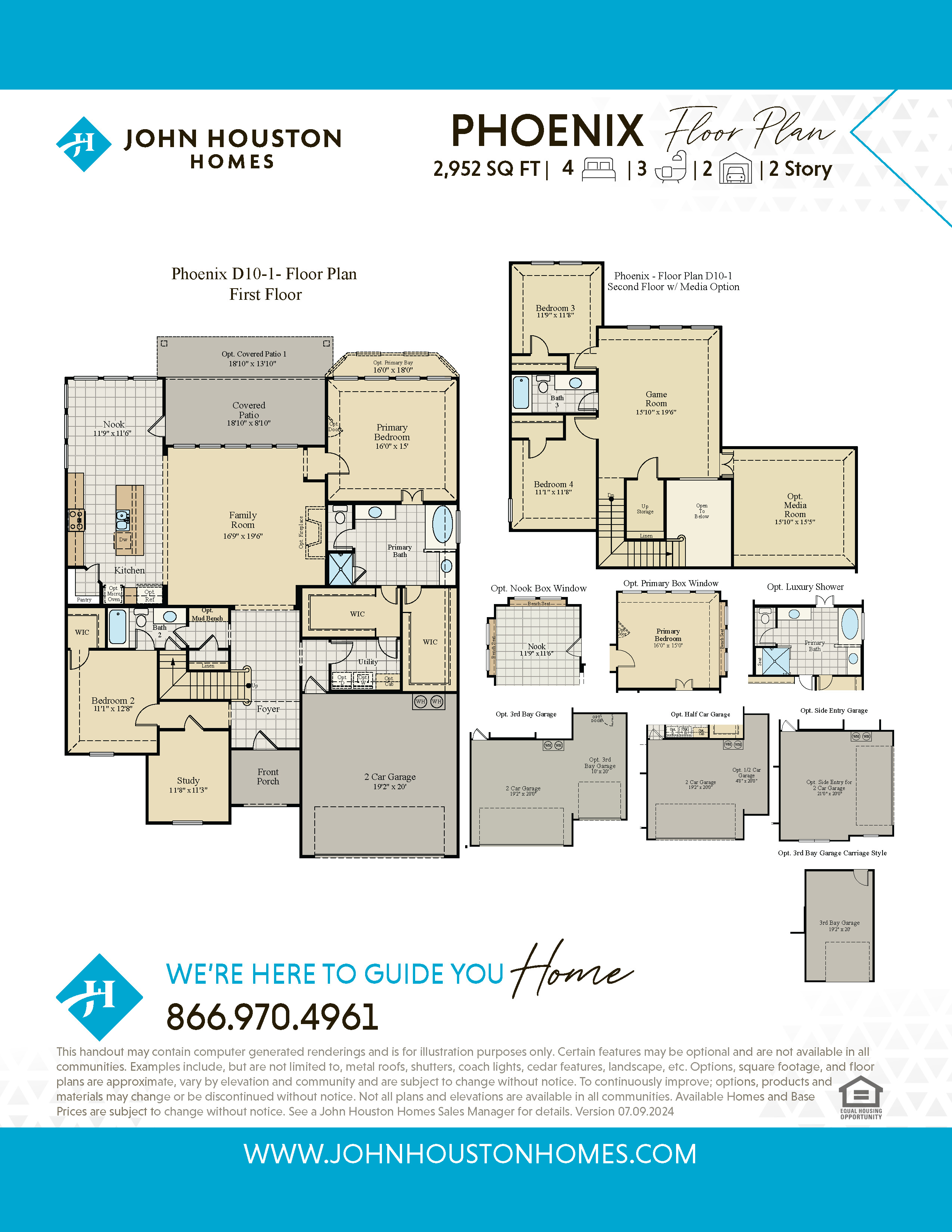 The Phoenix new home floor plan includes 4 bedrooms, 3 baths and a 2 car garage. This plan features stainless-steel appliances, covered patio, custom cabinets, fireplace, study, game room, walk-in closet in bedroom 2, large master bath with walk-in shower, soaker tub and dual vanities and 2 large master walk-in closets. Options available for this plan include extended covered patio, cabinets in utility room, cabinets in study, box windows in kitchen nook, door from master bedroom to patio, bay or box windows in master bedroom, luxury shower, 1/2 car garage, 3rd bay garage and media room. Options, square footage, room count, and room dimensions are approximate, subject to change without notice, and vary by elevation and community.