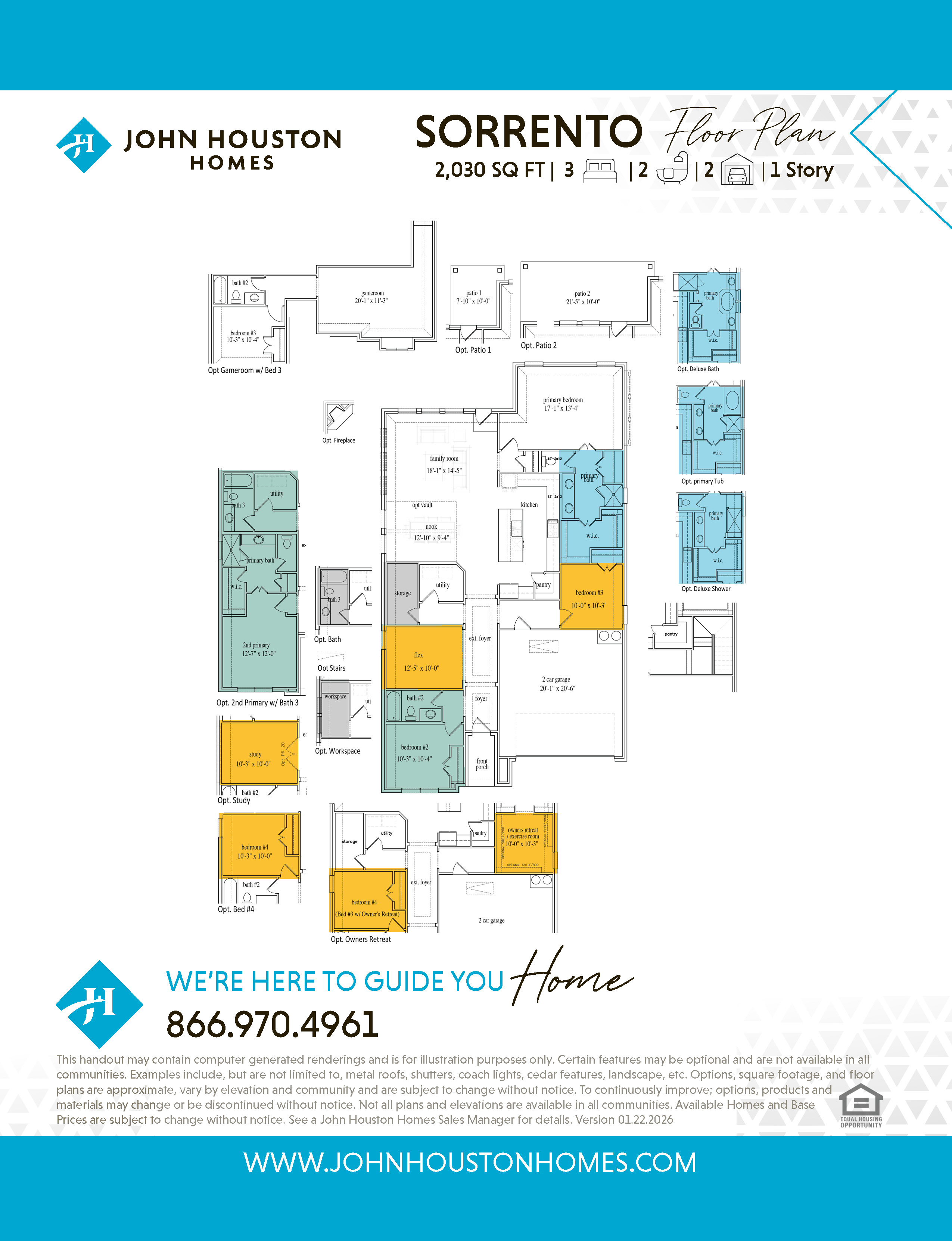 Introducing The Sorrento – our newest Flex Plan designed for modern living featuring 3 spacious bedrooms, 2 elegant bathrooms, and a welcoming extended foyer. The kitchen is a dream for entertaining, and the family room is sunkissed by natural light. Make it truly yours with options like a vaulted ceiling in the nook, an owner's retreat or exercise room, a second primary suite, a covered patio, charming fireplace, luxurious primary bath, workspace, game room, and more!