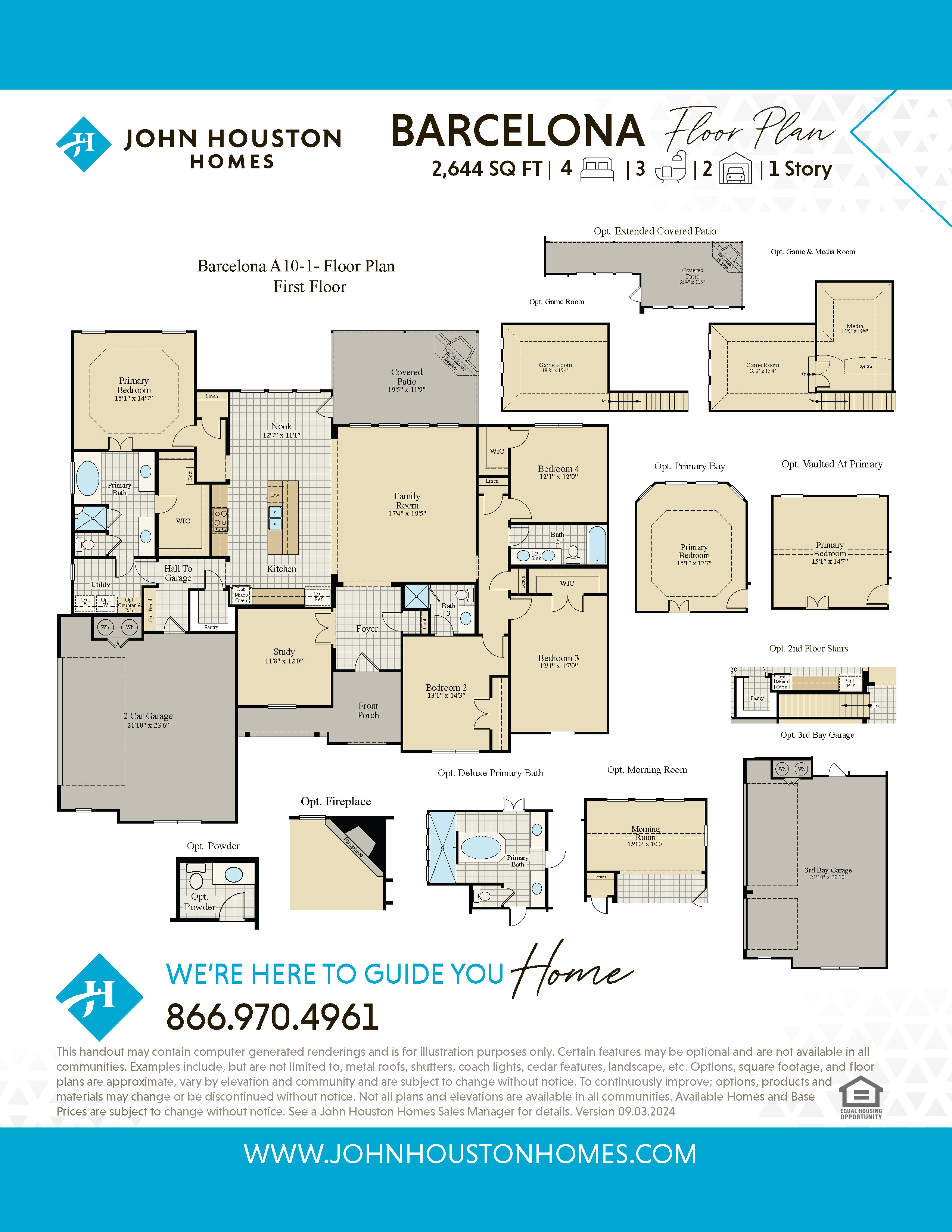 The Barcelona floor plan features 4 bedrooms, a study, 3 bathrooms and a 2-car garage. This plan also features access from master bathroom to utility, a mud room, large walk-in pantry, and large covered patio area. Options available are luxury master bath with walk around shower, upstairs game room, upstairs game room and media room with powder bath option, extended morning room in lieu of kitchen nook, vaulted master bedroom ceiling and extended garage and extended covered patio. Options, square footage, room count, and room dimensions are approximate, subject to change without notice, and vary by elevation and community.