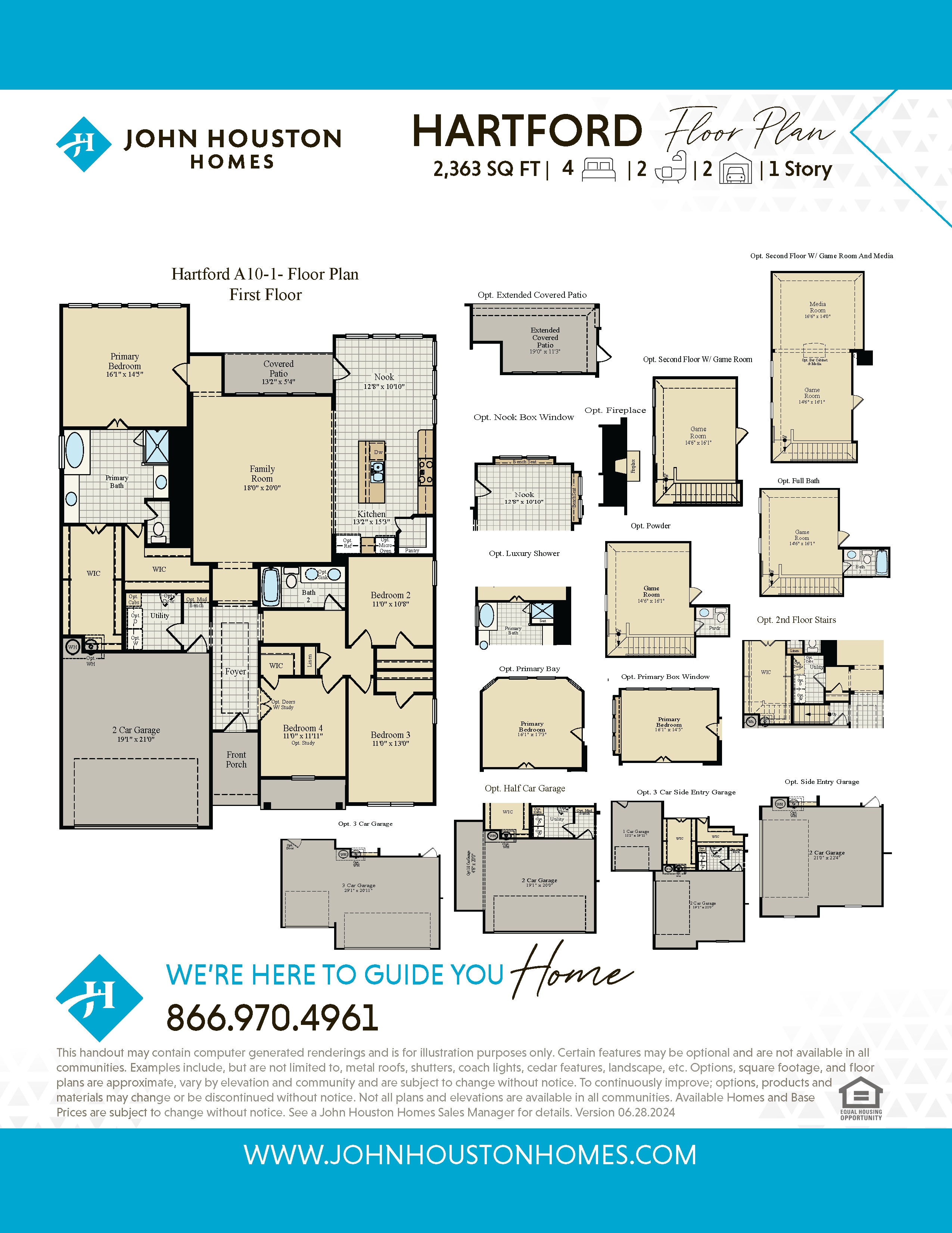 The Hartford new home floor plan includes 4 bedrooms, 2 baths and a 2-car garage. Unique features include extended foyer, his and her walk-in closets in the master bath, walk-in closet in bedroom 4 and covered patio. Options available for this plan include covered patio, bay or box windows in the master bedroom, box window in nook, luxury shower, study, mud bench, 2nd story game room with full bath and more! Options, square footage, room count, and room dimensions are approximate, subject to change without notice, and vary by elevation and community.