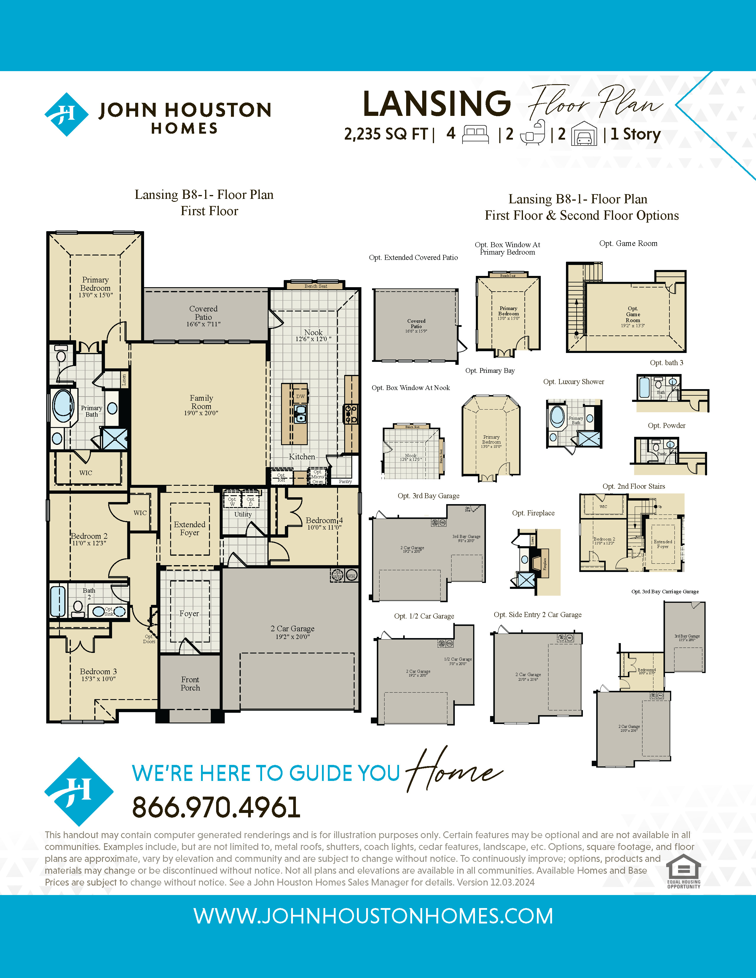 The Lansing new home floor plan includes 4 bedrooms, 2 baths and a 2-car garage. This one-story plan features stainless-steel appliances, custom cabinets, window seat in kitchen nook, large master bath with walk-in shower and soaker tub. Options available for this plan include covered patio, study in lieu of bedroom 4, upstairs game room with bathroom options, box window in master and nook, second sink in bath 2 and more. Options, square footage, room count, and room dimensions are approximate, subject to change without notice, and vary by elevation and community.