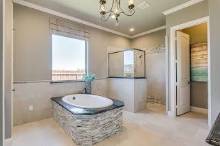 Our first stop is our newest model in Sandstone Ranch, The Titus. What makes this layout so desirable is hands down the master bathroom set up. The focal point is the beautiful tile and granite accented tub seen here.